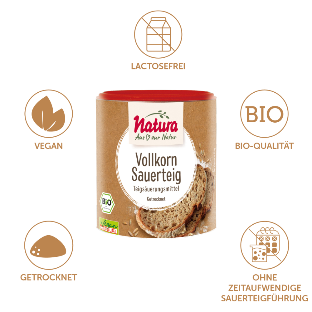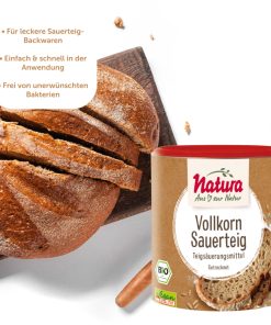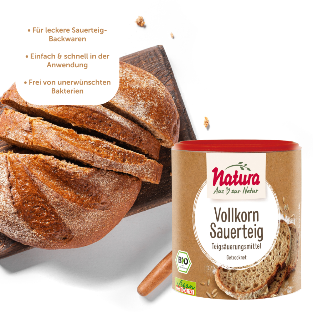 Ein klassischer Sauerteig braucht Zeit – oft mehrere Tage und mehrere Stufen der Reifung. Mit dem Natura Vollkorn-Sauerteig in Trockenform kannst du dir diesen Aufwand sparen und dennoch den typischen, aromatischen Geschmack von Sauerteig-Backwaren genießen.